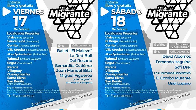 El municipio de Colonia Avellaneda realizará la Fiesta del Migrante los días viernes 17 y sábado 18 febrero en el predio del Prado Español. Con entrada libre y gratuita, la comuna invita a todos los interesados a “vivir Entre Ríos en un solo lugar”.