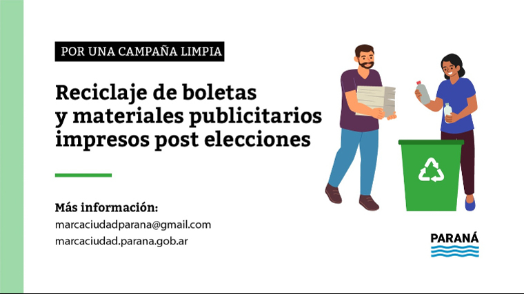 El Consejo Asesor de Marca Paraná vuelve a impulsar la campaña de reciclaje de boletas y folletería luego de las Elecciones Generales del 22 de octubre. Es por eso que invitan a los partidos políticos a adherirse a la iniciativa, cuyo objetivo es colaborar en reducir el impacto ambiental que tiene la campaña electoral y preservar la limpieza de la ciudad, a través del reciclado de boletas, folletos y demás papel sobrante.
