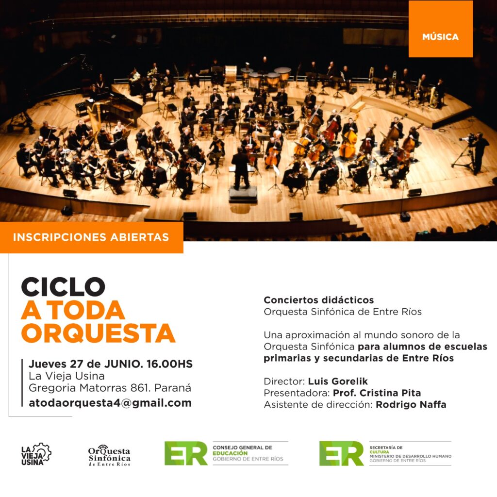 La Coordinación de Educación Artística del CGE junto a la Secretaría de Cultura de la provincia presentan en junio el esperado ciclo de conciertos didácticos: «A toda orquesta» en el Centro Cultural La Vieja Usina de la ciudad de Paraná.