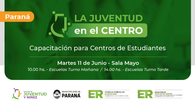 El taller La Juventud en el Centro, organizado por la Dirección de Juventudes de la Municipalidad de Paraná, la Dirección de Juventud y Niñez de la Provincia y el Consejo General de Educación (CGE), se dictará el 11 de junio en Sala Mayo a las 10, para escuelas de turno mañana; y a las 14 para las de turno tarde. Por cuestiones de espacio, podrá asistir un alumno por curso y un docente que acompañe el grupo.