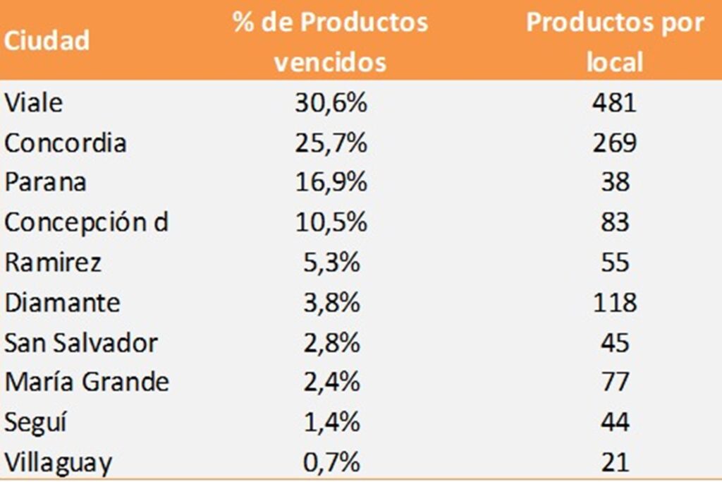El 19 por ciento de los controles restantes fueron en supermercados más pequeños, donde se desnaturalizaron 180 productos por local. Por ciudades, Viale registró el 30,6 por ciento de los productos intervenidos. Otro 26 por ciento de los alimentos no aptos para consumo fueron detectados en supermercados de Concordia.