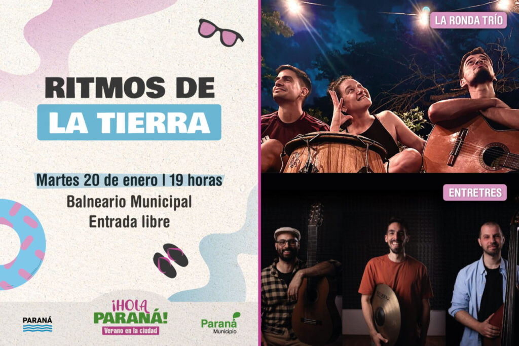 Este martes 20 a las 19 horas, en el Balneario Municipal de Paraná, se realizará una nueva jornada de Ritmos de la Tierra, propuesta cultural con entrada libre y gratuita que invita a disfrutar de la música y el paisaje en comunidad. En esta oportunidad se presentarán La Ronda Trío y Entretres.